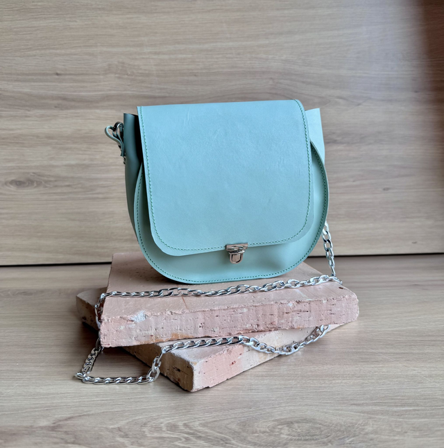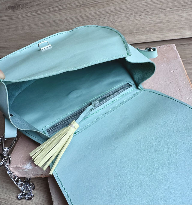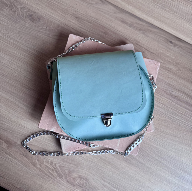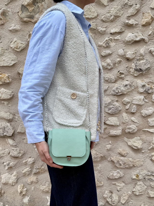 Petit sac à main confectionné à la main dans mon atelier en Dordogne, le modèle Bling est réalisé en cuir de vache lisse couleur menthe (vert clair, pastel). Il se porte en bandoulière grâce à sa chaîne en acier inoxydable argenté de 120 cm.