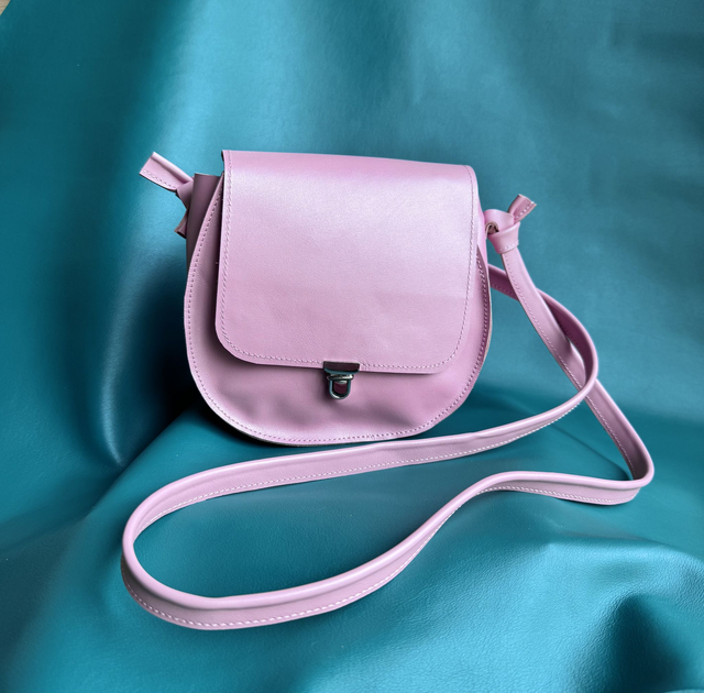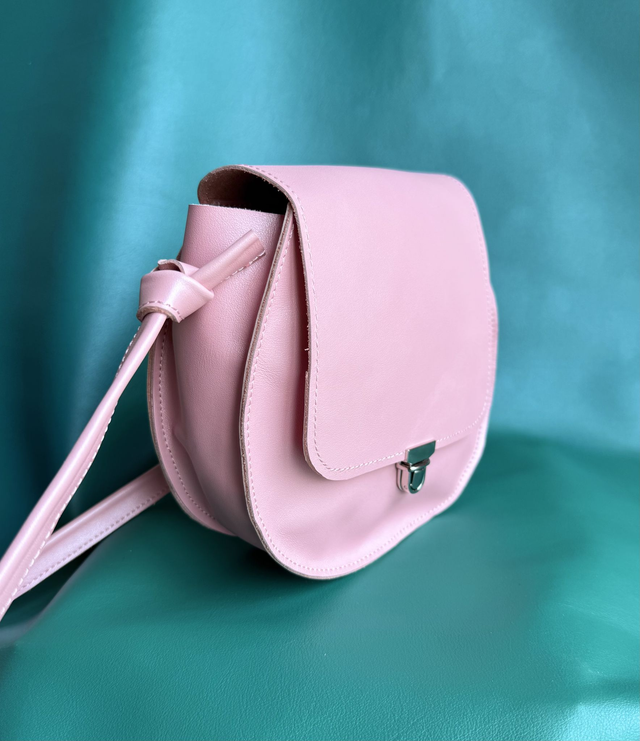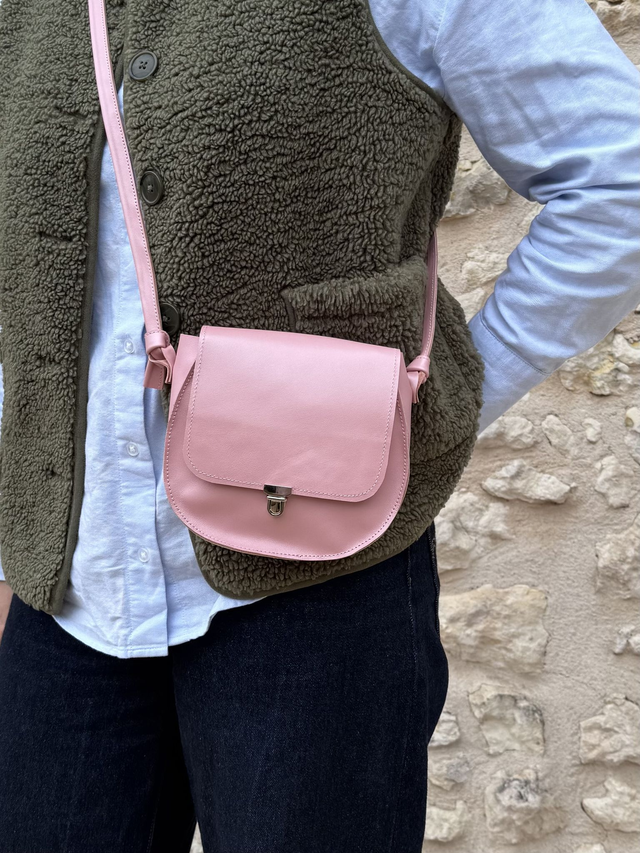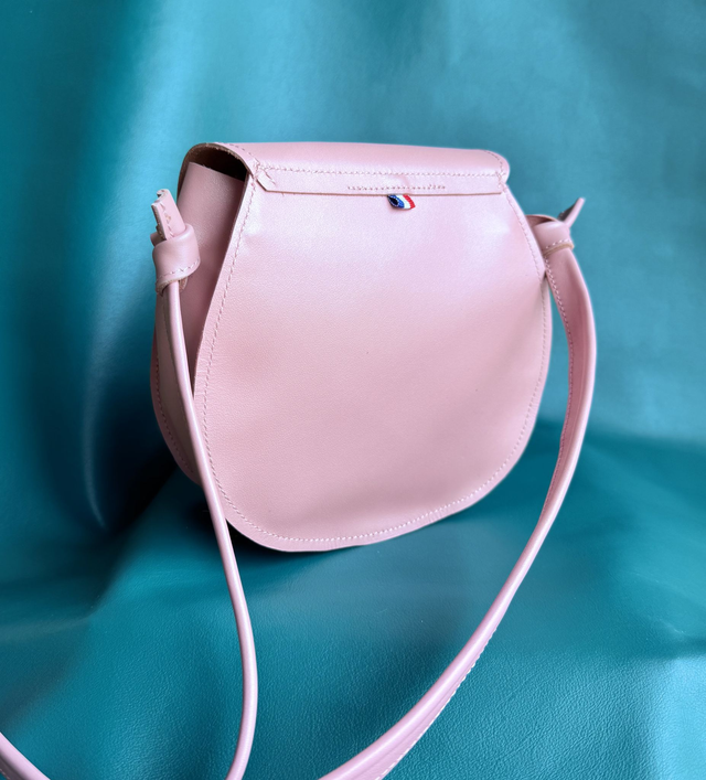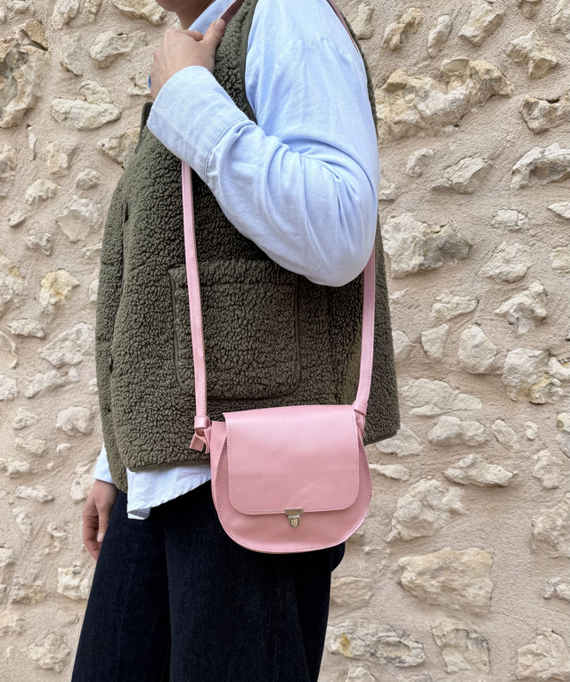 Petit sac à main confectionné à la main dans mon atelier en Dordogne, le modèle Bling est réalisé en cuir de vache lisse couleur rose pastel irisée. Il se porte en bandoulière grâce à sa lanière en cuir de 120 cm.