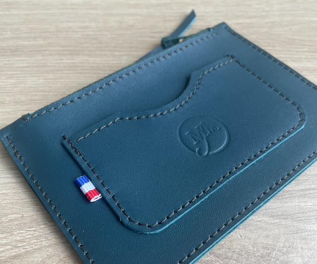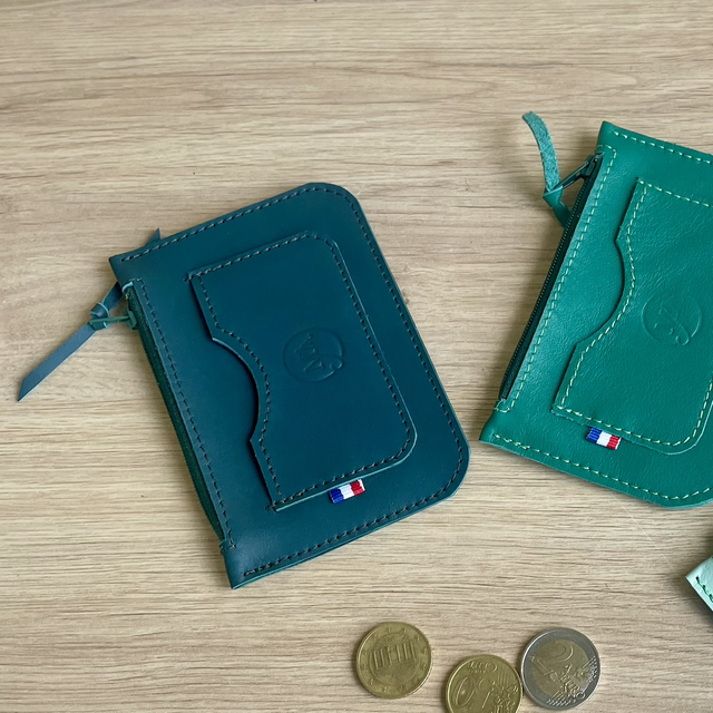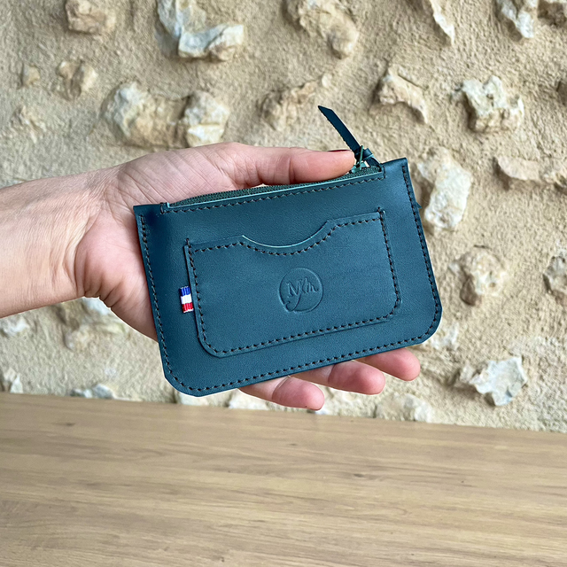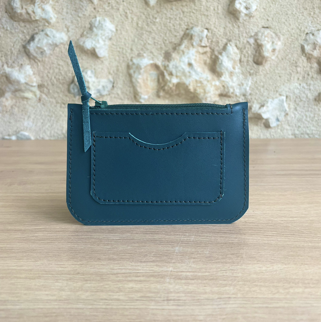Porte monnaie - porte cartes en cuir, couleur vert paon.